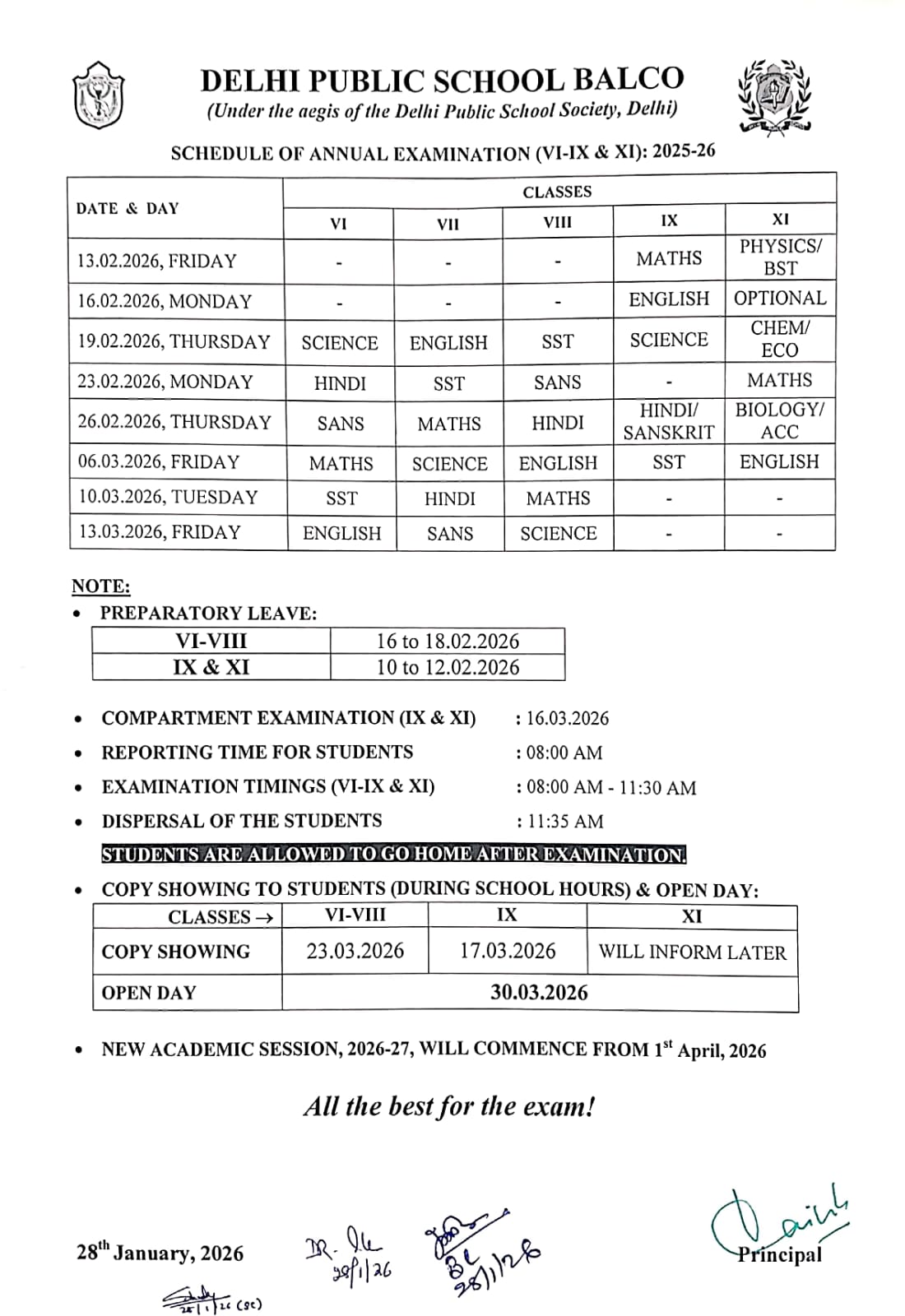 SCHEDULE OF ANNUAL EXAMINATION (VI-IX, XI, 25-26 (28.01.2026)